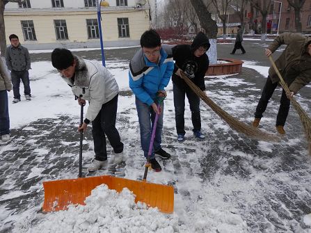 4月14日早上,哈尔滨普降暴雪,至上午9点大雪已覆盖了整个校园,伴随着凛冽的寒风,气温骤降。哈工大美丽的校园一片银装素裹,但严重影响校园交通,给大家的出行带来诸多不便。雪势转小后,学员第九小组在二公寓和三公寓之间进行了义务扫雪,以方便师生的通行。
