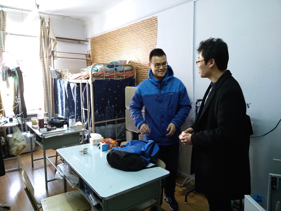 在学生寝室,各位辅导员与大家聊起了刚刚过去的寒假生活,同学们有的讲述了自己进行寒假调研的经历,有的分享了春节走亲访友中的趣事。气温转暖,老师们不忘提醒刚刚返校的同学们注意寝室卫生,定时通风。在大四学生寝室,李威老师向他们介绍了春季招聘情况,并鼓励几位正在准备公务员面试及研究生复试的同学认真备考。