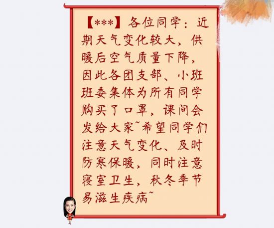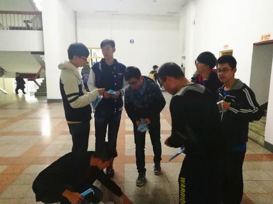 由于入秋以来天气情况多变,尤其在近日供暖后,同学们在早起出门后感觉不适、呼吸不畅。为了鼓励更多同学早起、自习,皇冠足球赔率 2016级各团支部、小班班委经过商议,为全年级的每名同学购买医用口罩。10月11日早,各团支部、小班班委代表于第一节课前聚集在致知楼二楼大厅,统一进行分配,于课间下发给同学们。希望同学们能够在每一个清爽的早晨,以崭新的面貌和状态迎接十九大的到来。