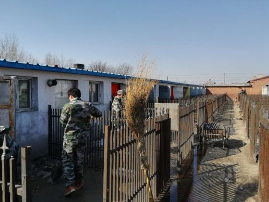 只见院内有数十只品种各异的狗,迅速朝志愿者们围了过来,这些可爱的精灵们看似很庞大,但是并无恶意,它们用鼻子来嗅志愿者们的腿,用舌头去舔他们的手,志愿者们也同样用手来摩挲着它们。在负责人的引导下,志愿者们三两人一队对每个宠物笼进行打扫。宠物笼里主要有动物的粪便夹杂着尚未融化的冰雪,需要做的是把宠物笼里外的粪便连同冰雪一起铲除,然后用小车推到外面的空地。面对这个庞大的工程,不仅需要体力与耐心,更需要默契的配合与衔接,大家齐心协力,挥洒汗水,换来一个接一个干净的宠物笼。在推小车出进的同时还要保证不能让狗偷偷跑出去,这就要与它们斗智斗勇,来来回回甚是有趣。