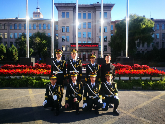 10月1日上午7:00,为庆祝中华人民共和国成立69周年、弘扬爱国主义精神,哈尔滨工业大学国旗护卫队举行庆祝建国69周年主题升旗活动。来自一、二校区的多名护卫队成员共同出席了本次活动。