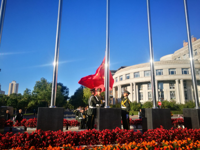 早上7时,国旗护卫队队员迈着矫健整齐的步伐,护卫着五星红旗走向升旗台。旗手们庄重严肃、整齐划一,铿锵的脚步声和激昂的国歌声飘荡在哈工大校园的上空。“起来!不愿做奴隶的人们……”慷慨激昂的国歌响起,升旗手振臂一挥,鲜艳的五星红旗迎风展开,冉冉升起。全体人员肃然而立,向五星红旗敬礼,对伟大祖国致以崇高的敬意和深深的祝福。