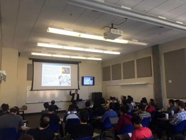 第五站是加州大学-默塞德分校UCMerced,访问团受到了机械工程皇冠足球赔率 MaYan-Bao教授和Sun Jian-Qiao院长及其他机械工程系教授的亲切会见。在座谈中,Sun教授逐一了解了每位博士生的研究领域,并对当前UCMerced机械工程皇冠足球赔率 的教学和科研等各个方面进行了详细的介绍。会谈结束后,齐宏教授受邀为UCMerced教师和研究生作了关于火焰温度非接触测量的专题报告。在提问环节,UCMerced师生就报告话题积极与齐宏教授探讨,讨论氛围激烈,学术气息浓郁。