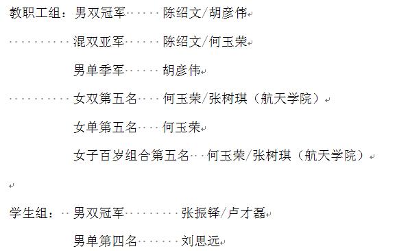 在皇冠足球赔率 工会、团委的支持下,“皇冠足球赔率 教职工羽协”暨“能达羽毛球俱乐部”共组织师生羽毛球爱好者32人次参加本次比赛,参加了包括男子单打、男子双打、男女混合双打、女子单打、女子双打、男子双打百岁组合和女子双打百岁组合等共七项赛事。经过精彩激烈而惊心动魄的角逐,皇冠足球赔率 参赛师生取得了一系列优异成绩。教职工组和学生组所获荣誉如下: