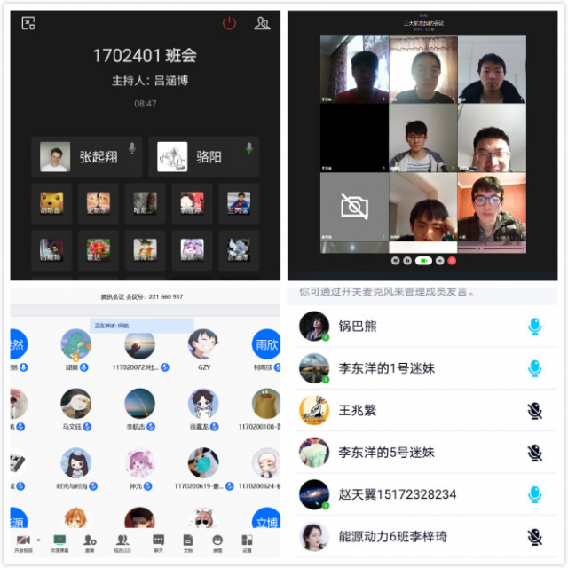 班会由各班班长主持召开,线上交流讨论。首先,在疫情爆发的一个多月以来,大家积极配合国家防控政策、居家抗疫、在家学习。班长也提醒大家虽然疫情现在已经稳定,但防疫思想却不能松懈,个人防控措施也不能减少。其次,围绕着网课学习,大家进行反馈讨论。虽然网上学习缺少了学校学习的氛围,但这就更加考验同学们的自觉性。大家通过平台获取课程资源与信息,按时打卡上课,和任课老师反馈交流,网络上课氛围良好。除了学习,跟着父母学习做饭炒菜,自觉打扫家里卫生,锻炼身体,利用课余时间进行了许多有意义的活动。随后,各位同学对于未来考研或者工作的选择进行交流,班委收集了大家各自的的情况与想法,为后期开展相关活动做准备。最后,辅导员和班主任老师也根据同学们的问题提出了自己的建议,希望同学们能及时反映在这段特殊时期所遇到的各种问题,全体团结一心,互帮互助,共渡难关。