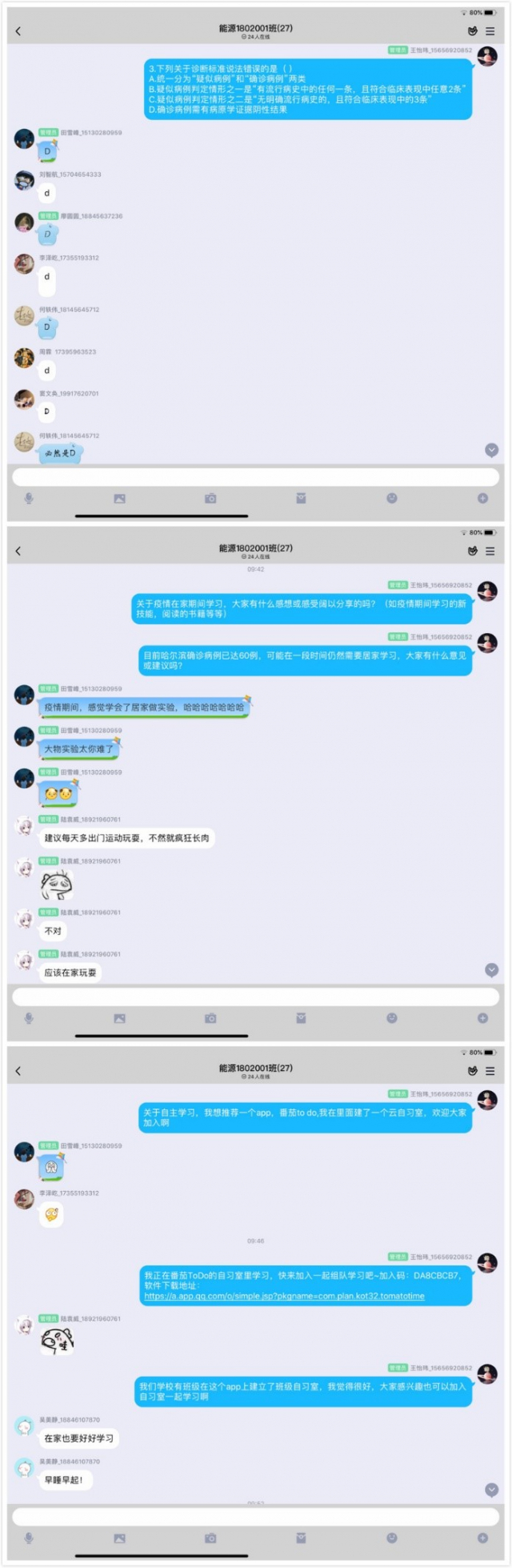 为增强广大团员抗击疫情的信心,展现团员青年居家学习的风采,4月26日上午,皇冠足球赔率 1802001团支部在团支书王怡玮的组织下,有序开展了主题为“战斗团支部·居家抗‘疫’展风采”的线上团日活动。班级同学通过QQ群在线沟通交流,积极参与到传染病防控与防疫知识竞答的活动中,并在活动后积极交流疫情期间居家学习方面的经历与感受,分享自己的防疫心得和思想收获。