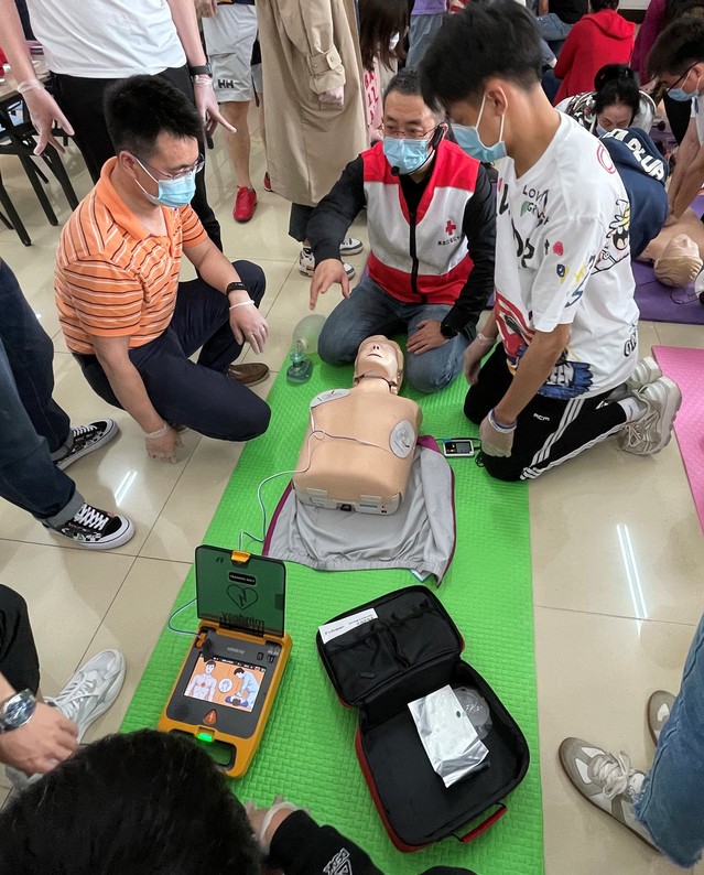 实操讲解方面,谭老师首先为大家演示了应急救护的初步检查的过程,通过初步检查判断是否应该进行救护,并介绍了常见的异常生命体征。随后重点讲解了心肺复苏和AED设备的使用。下午进行了教师指导下的自我练习和该环节的实操考核。培训的最后进行了创伤、止血与包扎的学习,并进行了包扎考核。