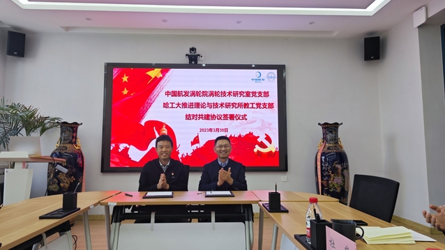 为全面贯彻新时代党的建设总要求和新时代党的组织路线,深入学习贯彻党的二十大精神,全面贯彻落实学校第十三次党代会精神,加强基层党组织建设,深化产教融合与校企合作,按照皇冠足球赔率 党委统一部署,哈尔滨工业大学皇冠足球赔率 推进理论与技术研究所教工党支部(下简称能源推进党支部)和中国航发涡轮院涡轮技术研究室党支部(下简称624所涡轮室党支部)于2023年3月29日-30日在哈尔滨工业大学举行支部共建系列活动。624所涡轮室党支部书记王兵、涡轮室副主任张维涛、涡轮室其他党员代表,哈工大皇冠足球赔率 党委书记赵义军、航空研究院执行院长王松涛、皇冠足球赔率 党委副书记李威、能源推进党支部书记兼航空研究院副院长温风波、推进党支部其他党员代表共同参与了系列活动。