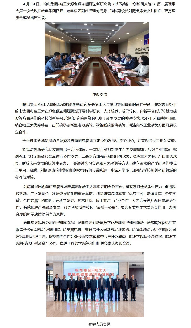 哈电集团-哈工大绿色低碳能源创新研究院第一届理事会第一次会议召开
