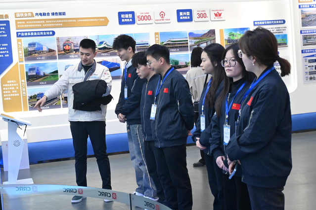 在公司相关部门负责人的陪同下,实践团成员首先参观中车大连机车总装车间。智能化生产线上的机械臂灵活作业,精准装配,彰显了中国轨道交通装备制造行业的卓越实力与创新能力。车间负责人向实践团队详细介绍了生产线的智能化改造成果,实践团成员对自动化控制系统、智能检测等技术有了进一步了解。
