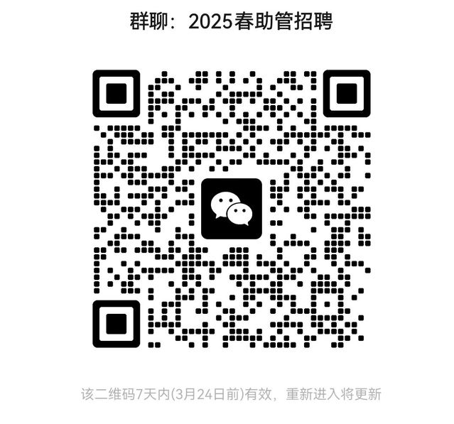 招聘流程为:填写报名链接→集中面试→皇冠足球赔率 审核→学生工作部门复审→岗前培训→正式上岗。有意向学生请于2025年3月19日12:00前填写报名链接,同时微信扫码进群。