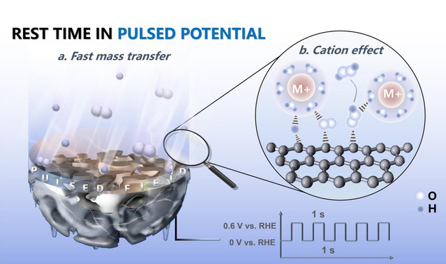 哈工大全媒体(闫明星丁雅妮 周伟 文/图)近日,皇冠足球赔率 高继慧教授团队在新型脉冲电催化体系的机制研究中取得新进展,首次揭示了脉冲供电在氧还原合成过氧化氢(H2O2)体系中对界面物质输运及反应中间体形成动力学的跨尺度调控机制,为发展能源电催化反应调控手段提供了新思路。研究成果以《揭示氧还原反应中脉冲电催化对界面微环境的原位动态调控》(Revealing the In Situ Dynamic Regulation of the Interfacial Microenvironment Induced by Pulsed Electrocatalysis in the Oxygen Reduction Reaction)为题发表在《美国化学学会能源快报》(ACS Energy Letters)上,并入选封面文章。